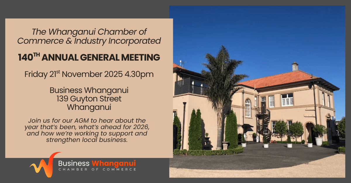 Notice of Annual General Meeting Whanganui Chamber of Commerce and Industry Incorporated 140th Annual General Meeting to be held Friday 21st November 4.30pm at Business Whanganui, 139 Guyton Street, Whanganui Members are advised that the 140th Annual General Meeting of The Whanganui Chamber of Commerce & Industry Incorporated (t/a Business Whanganui) will be held […]